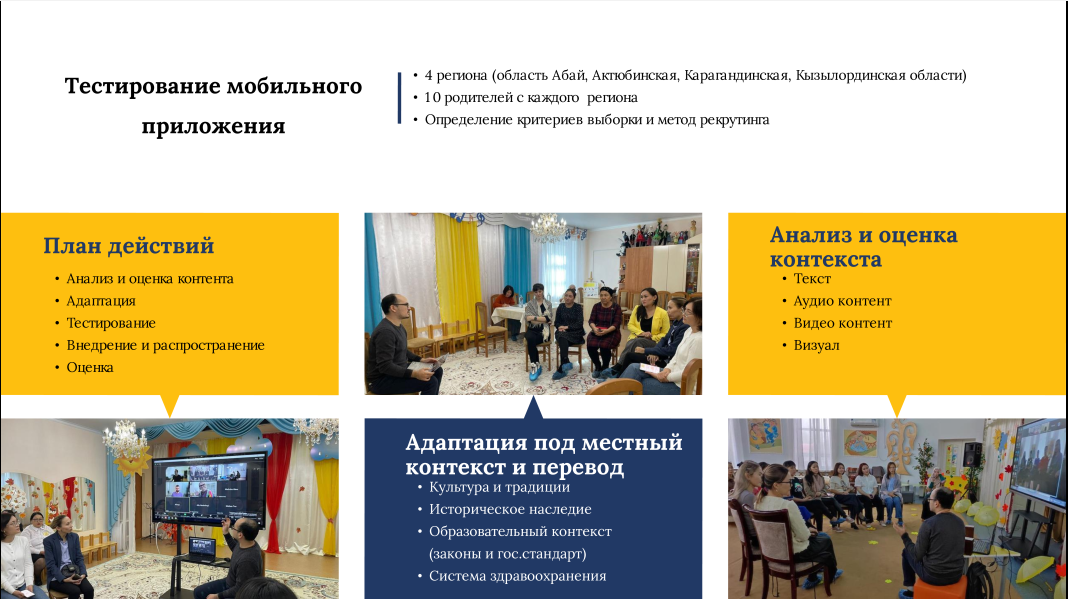 Приложение прошло апробацию в 4-х регионах (область Абай, Актюбинской, Карагандинской, Кызылординской областях), получило положительные отзывы родителей, педагогов и экспертов. В настоящее время мобильное приложение масштабируется по всей стране через консультационные пункты для родителей, дошкольные организации и другими доступными способами.
